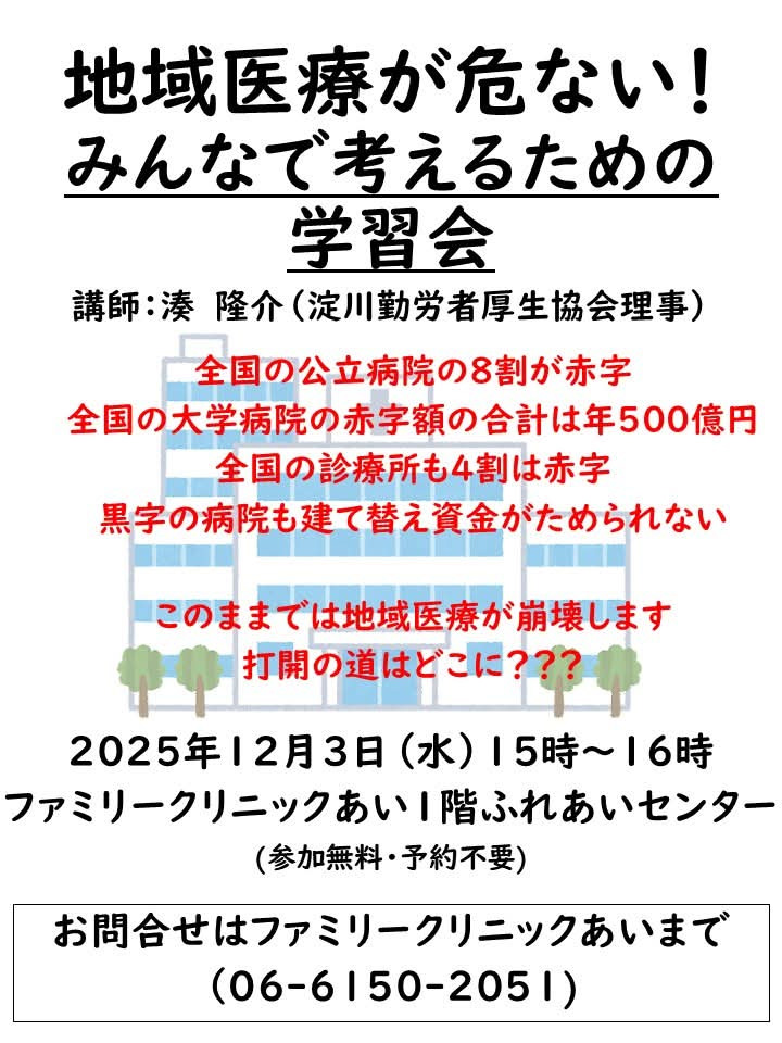 ・日時:12月3日(水)15時~16時 ・場所:ファミリークリニックあい1階 ふれあいセンター (淀川区西三国1-3-29) ・参加無料、予約不要