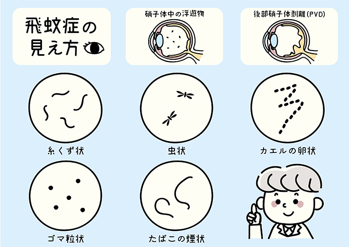 目の中には、硝子体(しょうしたい)というゼリー状の透明な組織あり、加齢などで濁りが生じると、その影が網膜に映って浮遊物のように感じます。高齢の方では加齢変化によることが多く、近視の方は若くても起こることがあります。