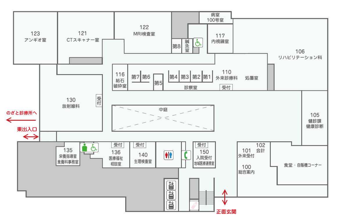 生理検査室、医療福祉相談室、食養科、食堂、地域医療連携室、外来診察室