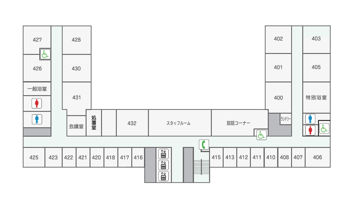 1床室:14室 / 2床室:2室 / 3床室:8室 / 4床室:3室 / 計:54床