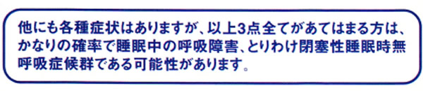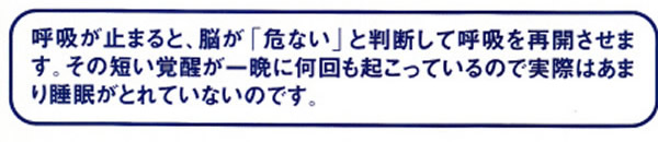 呼吸が止まると、脳が「危ない」と判断して呼吸を再開させます。その短い覚醒が一晩に何回も起こっているので実際はあまり睡眠がとれていないのです。