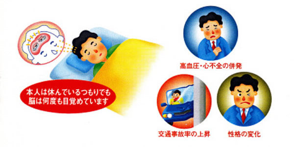 この病気は、すぐにどうなるというものではありませんので、多くの場合は単なるイビキの変形と受け止められ、見過ごされてきました。しかし、最近になり何もせず放置した場合、性格の変化、交通事故率の上昇を招くばかりか、通常の3~9倍の死亡率の上昇をもたらし、確実に生命予後を悪化させる疾病であることが判明してきました。一晩のうちに40回から数100回も呼吸が停止すると、そのたびに酸素欠乏になり、体が休憩できず、脳や心臓血管系をじわじわといため続けていく病気なのです。