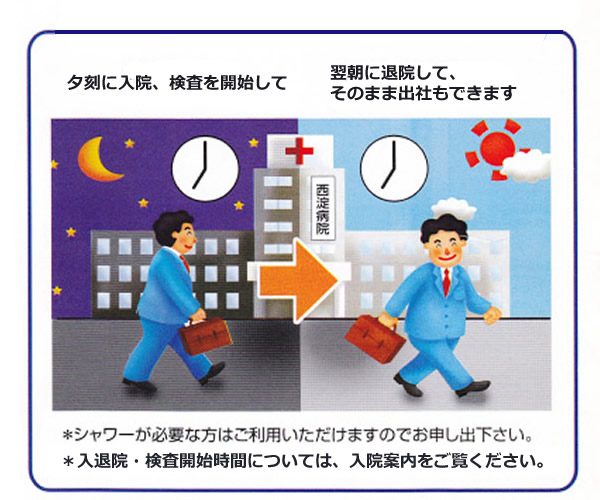 睡眠時に起こる症状を診断する為に、検査入院が必要ですが、決して大げさなものではありません。通常、1泊2日の入院になります。夕刻に来院していただき、検査のためのセンサーをつけて眠っていただきます。翌朝退院となります。検査の解析に2週間かかりますので、外来の診察の日に検査結果と診断およびそれに基づいた治療方針の説明を行います。