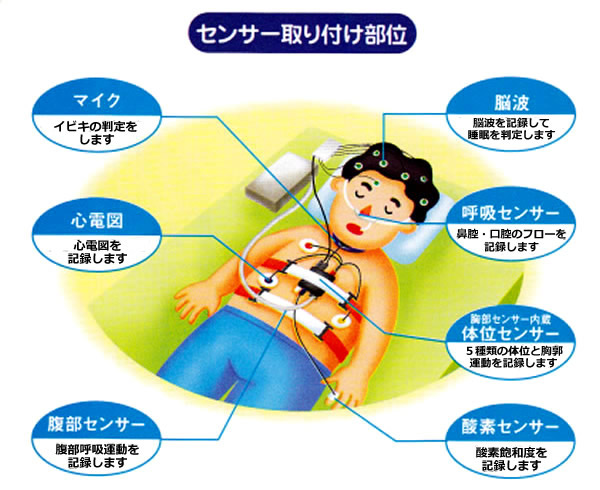 この検査では、睡眠中の脳波、呼吸の状態や、酸素飽和度、心電図、いびき音などを記録するため、下図のようにさまざまなセンサーをつけて生体情報をとります。少し煩わしい感じはありますが、痛みはありません。また、センサーをたくさん着けているので眠れないのでないかと思われますが、実際にはほとんどの人が眠っておられます。なお、当院では検査に際しては、いびきの大きい方も周囲を気にせず眠っていただけます。