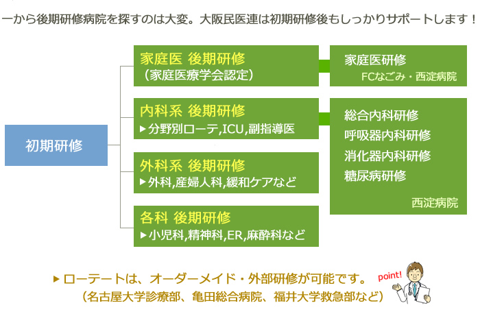 総合内科(6ヶ月):西淀病院(218床、大阪市西淀川区)or耳原総合病院(384床、堺市)orコープおおさか病院or東大阪生協病院
