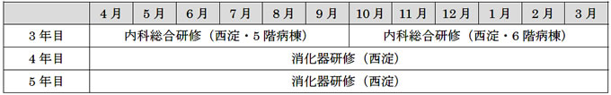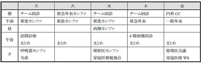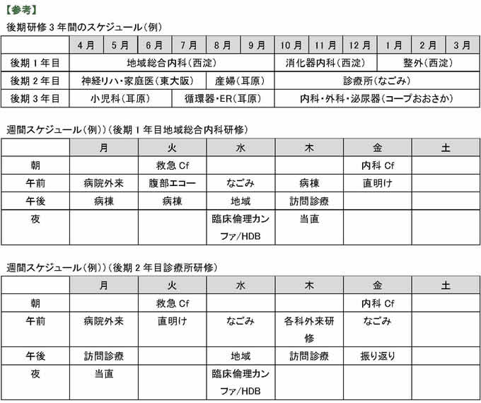 - 外来研修:一般外来は内科研修中の病院もしくは近接診療所で、指導医を決めて研修。初期研修で外来診療を経験していない研修医は、見学→診察前に相談の段階的研修。終了後フィードバック。救急外来を所属の病院で週1~2回行う。