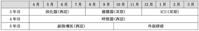 3年目前半の地域総合内科での研修(6ヶ月以上)、5年目前半での地域総合内科での副指導医を必須とする。残りの期間は初期研修で不十分だった分野を中心にローテーションを行う(大阪民医連の他院所も含む)。希望により6ヶ月までの外部研修も可能である。