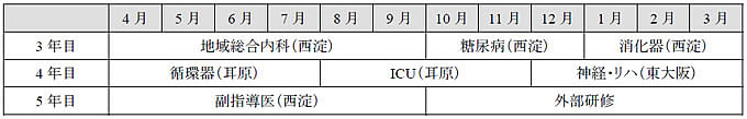 - 病院で外科、産婦人科、小児科、精神科、整形外科、皮膚科、泌尿器科などプライマリケアの現場でよく遭遇する症状の対処ができるように研修を行う(後期1年目に行ってもよい)。